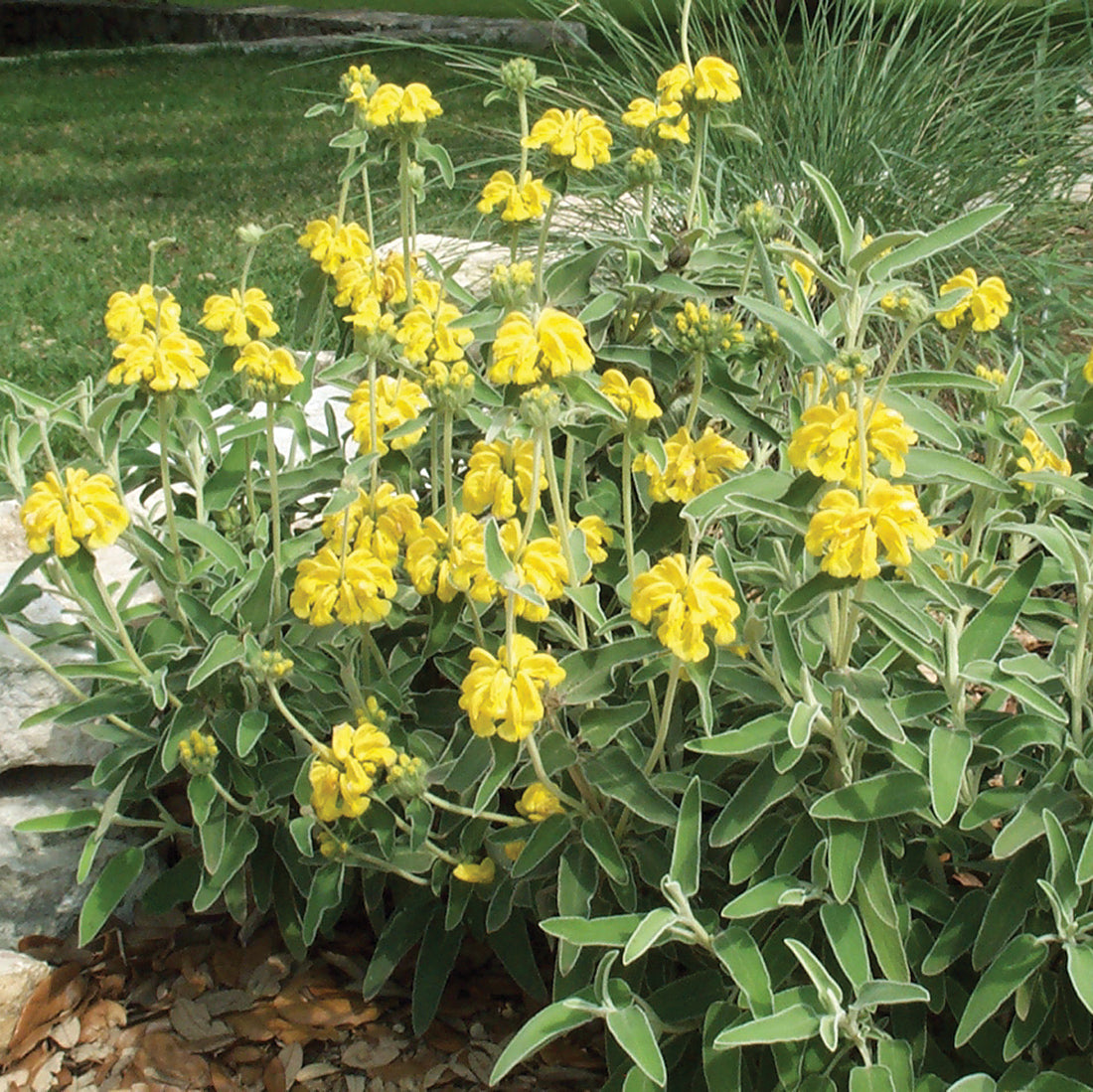 Jerusalem Sage is a striking evergreen to semi-evergreen shrub admired for its soft gray-green foliage and bright yellow flower whorls that bloom in late spring to early summer. The velvety leaves add texture and contrast to the landscape year-round, even when the plant is not in bloom. With its upright, architectural form, Jerusalem Sage is ideal for Mediterranean gardens, borders, slopes, and low-water landscapes. Highly drought-tolerant once established, it is a dependable and low-maintenance choice for warm, dry climates.