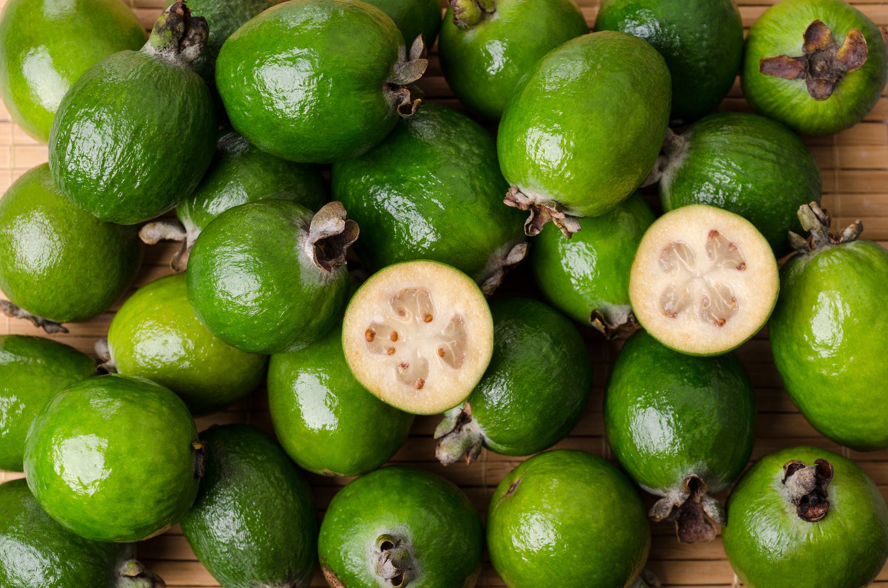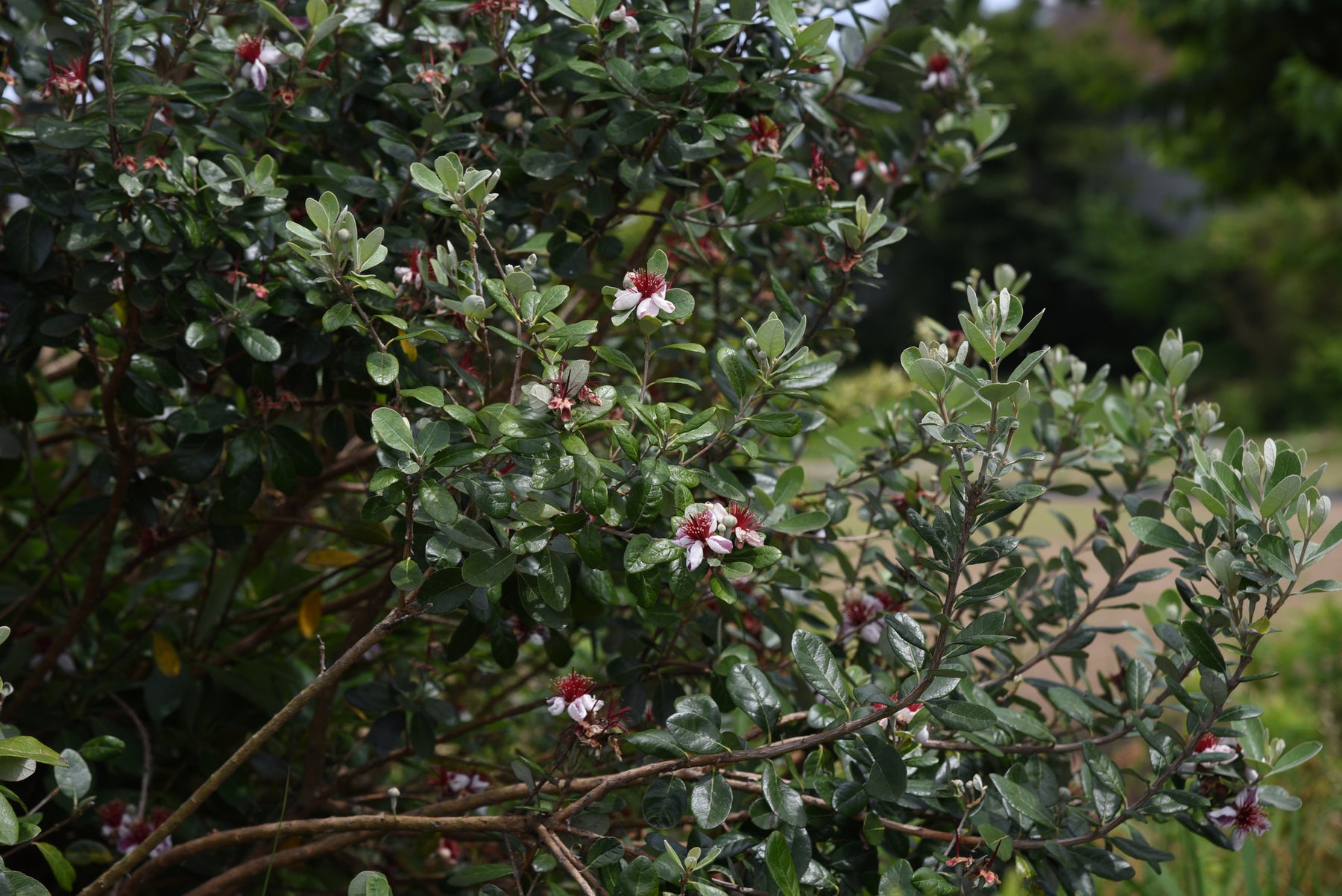 Pineapple Guava is an evergreen fruiting shrub or small tree valued for its attractive foliage, showy flowers, and flavorful fruit. The oval green fruit has fragrant, sweet flesh with a tropical flavor reminiscent of pineapple and mint, making it excellent for fresh eating, desserts, and preserves. In late spring, the plant produces striking white flowers with red centers and edible petals that add ornamental appeal. Hardy and adaptable, Pineapple Guava is commonly used in edible landscapes, hedges, screens, and home gardens.