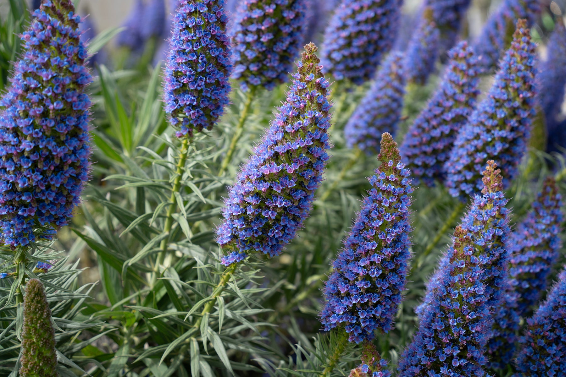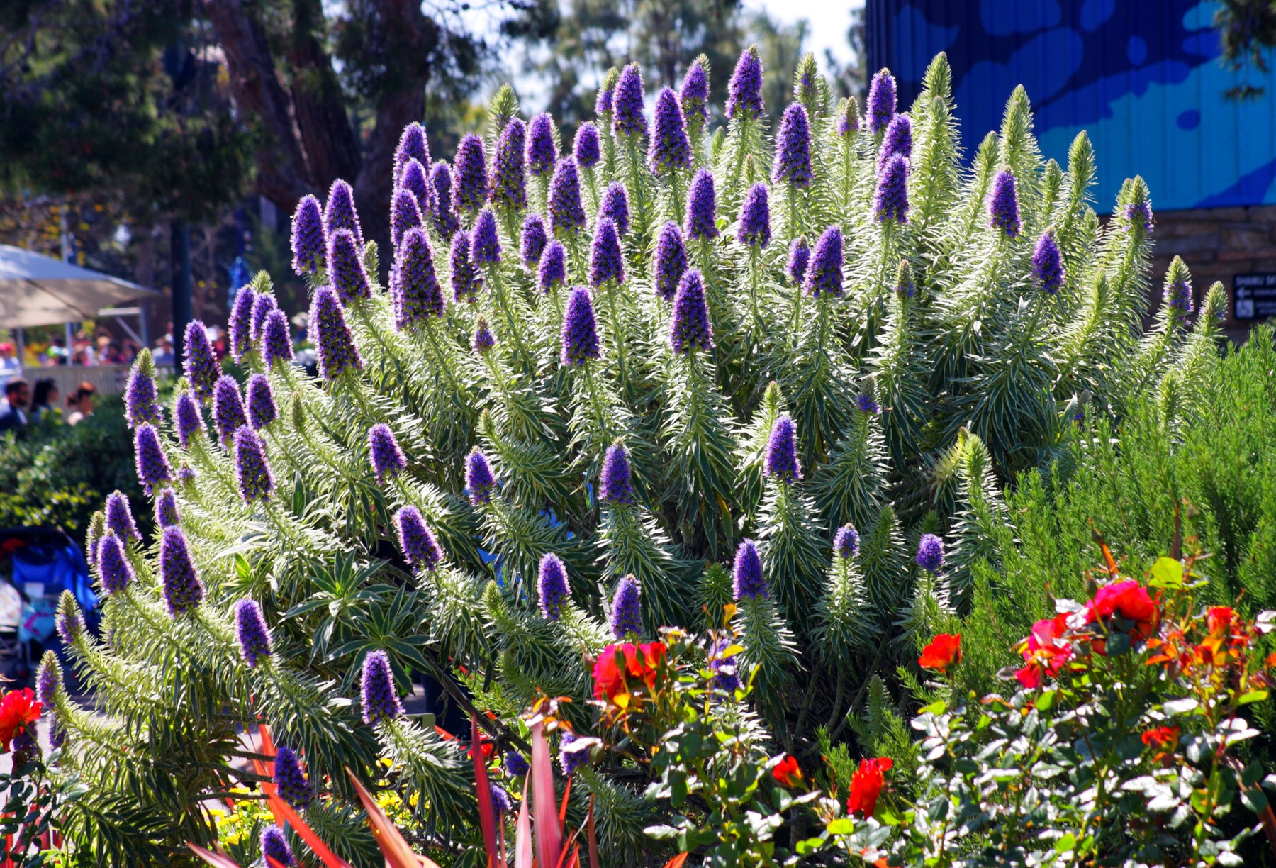 Pride of Madeira is a striking evergreen shrub admired for its dramatic, cone-shaped flower spikes covered in vibrant purple-blue blooms. Flowering in late winter through spring, the tall flower spikes rise above silvery-green foliage and attract bees, butterflies, and other pollinators. This bold plant adds strong architectural interest and color to coastal gardens, slopes, and Mediterranean-style landscapes. Highly tolerant of wind, salt spray, and drought once established, Pride of Madeira is a standout choice for low-maintenance, water-wise plantings.